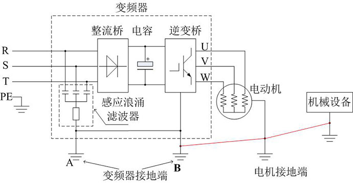 為了避免這個問題的發(fā)生,變頻器硬件在設(shè)計的時候,就加入了感應(yīng)電浪涌濾波器電路(其等效電路如圖1所示),并將感應(yīng)浪涌濾波器的接地端與變頻器的外殼相連,同時在變頻器的配線說明中,要求將電機的接地端與變頻器的接地端子B相連、將輸入電源的地(即大地)與變頻器的接地端子A相連。