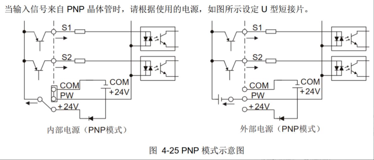 變頻器S(DI)端子的公共端PW和外部電源的正極短接,通過(guò)虛線(xiàn)左側(cè)的外部電路使S端子與外部電源的負(fù)極接通,電流即可形成回路,S1端子輸入為真。