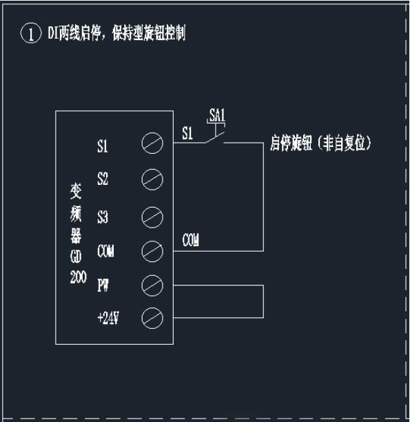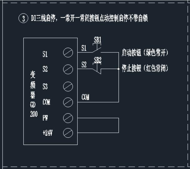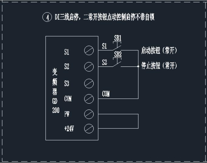 在不考慮正反轉(zhuǎn)控制的情況下,端子啟停主要有2線(xiàn)啟停和3線(xiàn)啟停兩種方式。