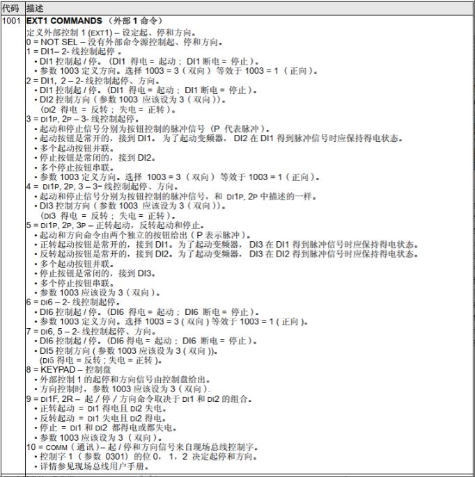 總之,這些對(duì)應(yīng)上圖表中與啟停關(guān)聯(lián)的參數(shù)都必須使能才能使變頻器運(yùn)行起來(lái)。如果變頻器沒(méi)有如期運(yùn)行,請(qǐng)依次檢查1-6及10號(hào)位對(duì)應(yīng)的參數(shù)。