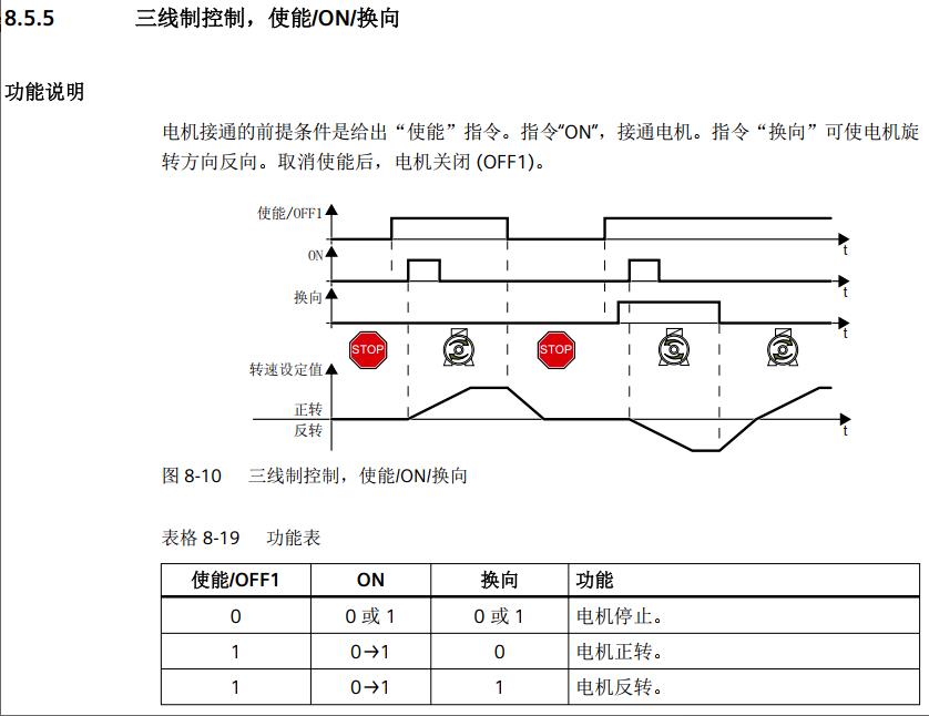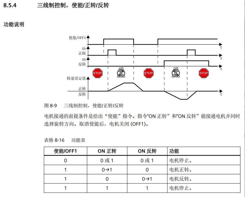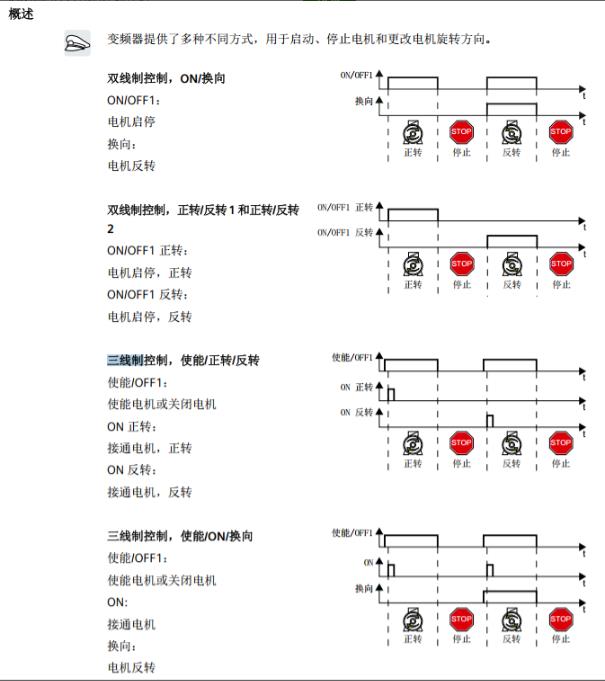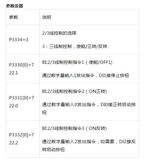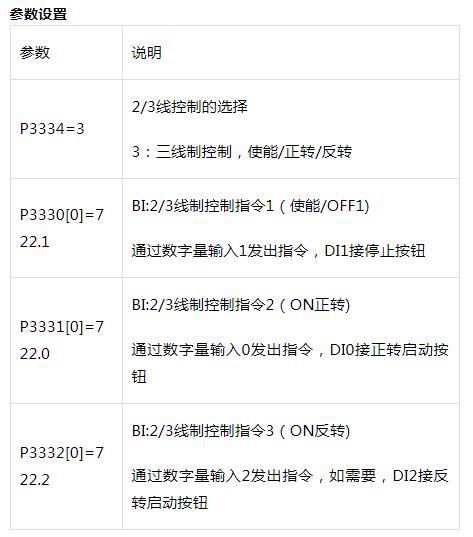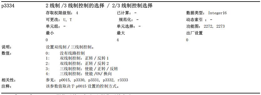 通過(guò)參數(shù)P3334進(jìn)行選擇,然后通過(guò)參數(shù)P3330,P3331,P3332參數(shù)連接至r722數(shù)字量DI輸入狀態(tài)即可實(shí)現(xiàn)兩線(xiàn),三線(xiàn)控制。