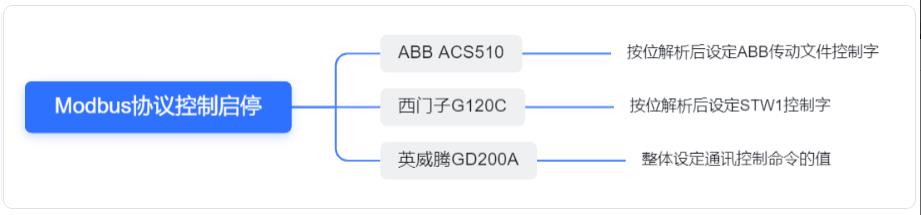 總的來(lái)說(shuō),以下三種變頻器使用Modbus協(xié)議都是通過(guò)控制字來(lái)控制變頻器的啟停,手冊(cè)中可以查詢(xún)到控制字對(duì)應(yīng)的寄存器地址,不同的是英威騰變頻器是通過(guò)一個(gè)具體的值來(lái)控制變頻器的運(yùn)行方式,而ABB和西門(mén)子變頻器都是通過(guò)控制字按照位功能實(shí)現(xiàn)變頻器運(yùn)行的控制。
