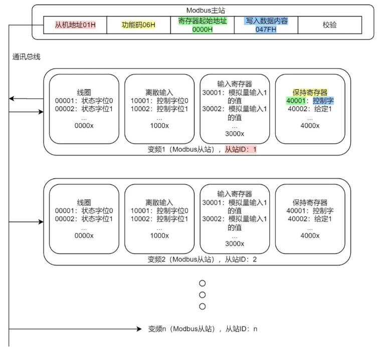 主站通過(guò)通訊總線(xiàn)向所有從機(jī)發(fā)送Modbus報(bào)文,將控制字的內(nèi)容寫(xiě)入指定的從站的指定寄存器中。如圖中所示主站發(fā)送的報(bào)文所有從站都可以收到,但只有與報(bào)文中的從機(jī)地址相符的從站中指定寄存器的值會(huì)改變并返回相應(yīng)的報(bào)文,其他從機(jī)地址不匹配的從站寄存器中的控制字內(nèi)容不會(huì)改變,也不會(huì)返回報(bào)文。
