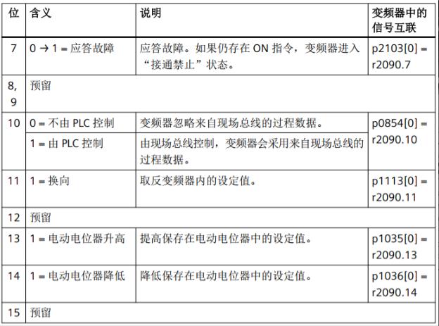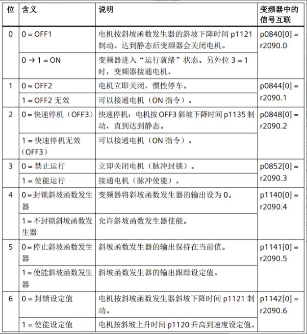 上表中最右側(cè)的列中列出了每個(gè)功能的參數(shù)地址,例如p0840[0]表示ON/OFF1參數(shù),而r2090.0則代表控制字的第0位。設(shè)置p0840[0]=r2090.0就將ON/OFF1和控制字的第0位關(guān)聯(lián)起來(lái),用現(xiàn)場(chǎng)總線(xiàn)改變控制字的第0位就相當(dāng)于改變了ON/OFF1的值,就可以控制變頻器的啟停。
