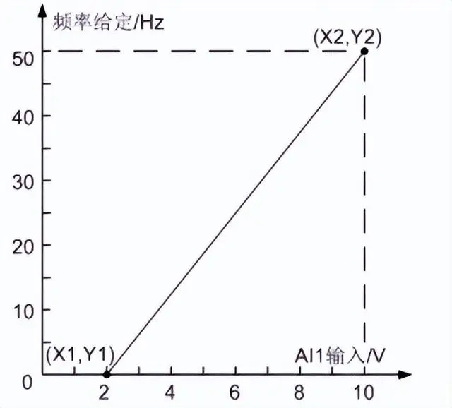 P0760[0]=100.00,直線上第二個(gè)點(diǎn)的縱坐標(biāo)Y2為100%,對(duì)應(yīng)50Hz