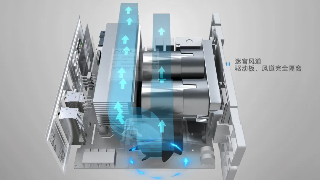 MD600采用迷宮風(fēng)道設(shè)計(jì),風(fēng)道與驅(qū)動(dòng)板完全獨(dú)立,加上100%三防漆,有效防止雜質(zhì)、粉塵等進(jìn)入驅(qū)動(dòng)板內(nèi)部,保障在惡劣環(huán)境中的可靠運(yùn)行。MD600還可自定義正反轉(zhuǎn),有效防止棉絮等異物堵塞風(fēng)道。同時(shí)采用無(wú)驅(qū)風(fēng)扇,風(fēng)扇驅(qū)動(dòng)集成在驅(qū)動(dòng)板內(nèi)部,增加易損件的可靠程度。