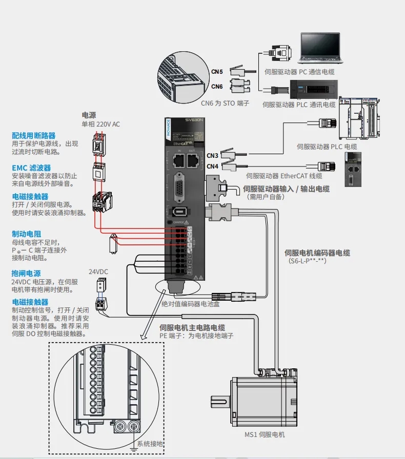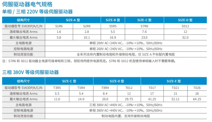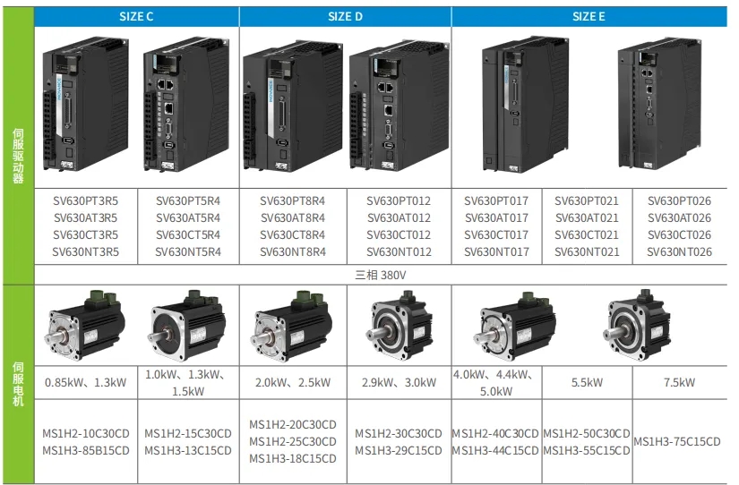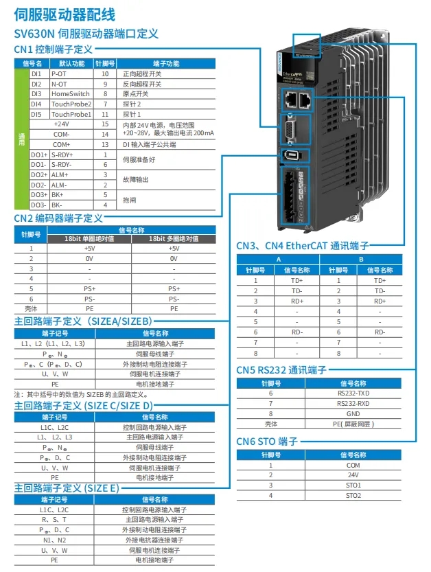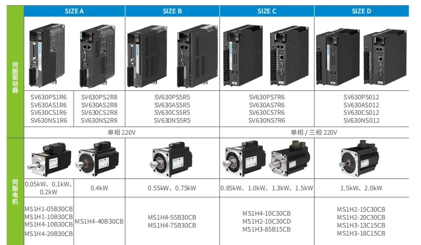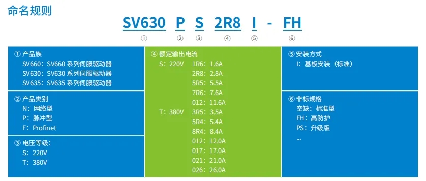 產(chǎn)品線主要有SV680、SV670、SV660、SV630,現(xiàn)市場主要用的是630和660,其中660帶磁編23位絕對值,630帶18位光編絕對值,功能有所裁剪,其他均差不多,下以630為例子說選型以及線纜接線等。