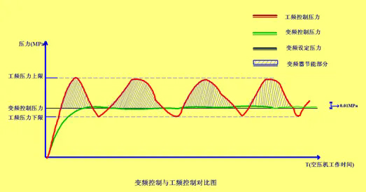 例如:假設(shè)實(shí)際用氣壓力為7Bar,工頻機(jī)組設(shè)定“工作壓力上限”和“工作壓力下限”分別為6bar和8bar。壓力就在8bar和6bar之間浮動(dòng),而電磁閥在8bar時(shí)卸載,6bar時(shí)加載,2bar壓差就帶來了高負(fù)荷電流損耗。圖中陰影部分即為節(jié)省的能耗。