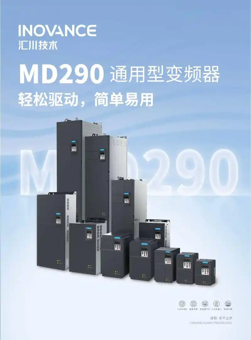 匯川變頻器MD290系列變頻是一款通用型變頻器,可以輕松驅(qū)動和控制異步電機,具備用戶可編程功能及后臺軟件監(jiān)控、通訊總線功能,體積小,功能強大,性能穩(wěn)定,滿足國際主流標準和認證�?蓱糜诩徔�、造紙、拉絲、機床、包裝、食品、風機、水泵等行業(yè)及各種自動化生產(chǎn)設備的驅(qū)動。
