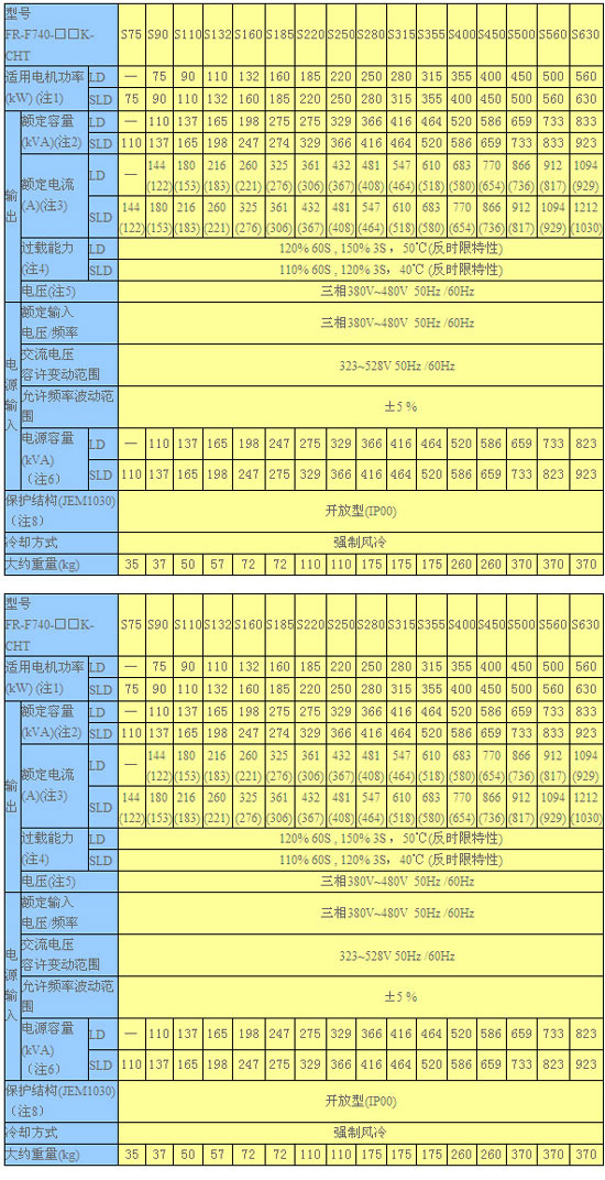 注: 1.表示適用電機(jī)容量是以使用三菱標(biāo)準(zhǔn)4極電機(jī)時的最大適用容量。