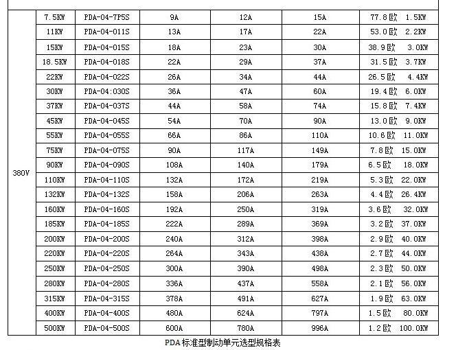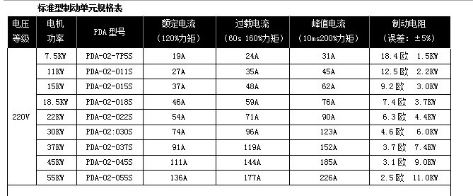 制動電阻是指PDA系列制動單元所允許配接制動電阻值,實據(jù)使用的制動電阻必須根據(jù)制動單元所配設(shè)備的容量和所需制動力矩進行選取。最好選擇IPC標準電阻,保證100%能使用